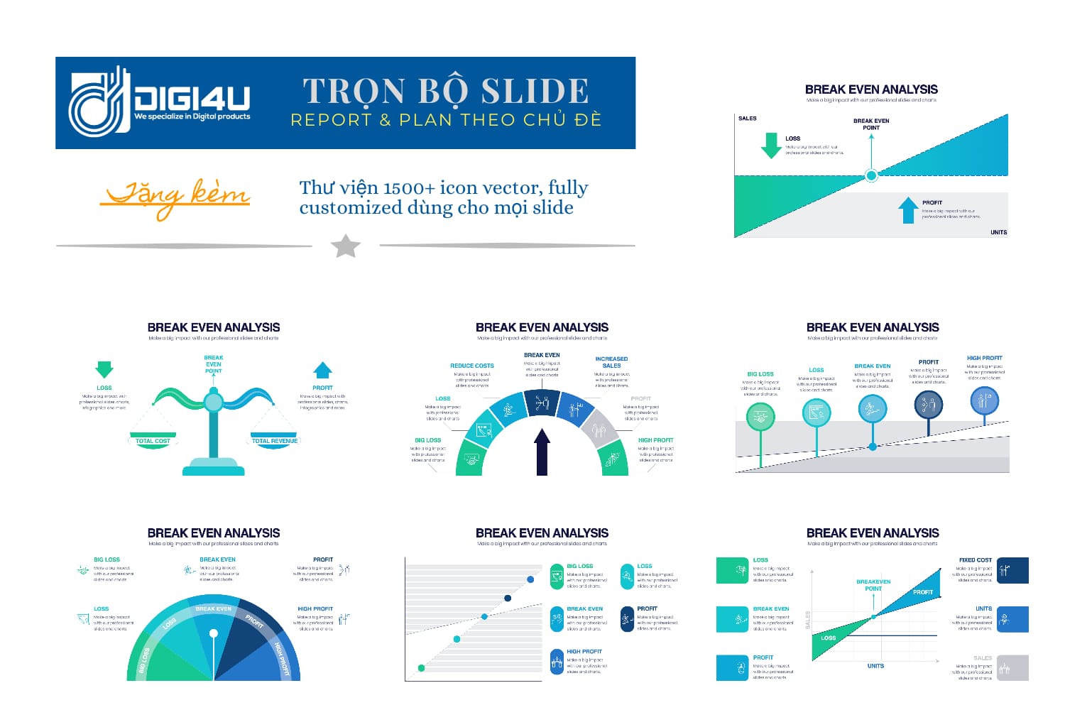• Break Even Analysis Template là bộ 20 slides mẫu làm báo cáo/ kế hoạch với visual ấn tượng & khả năng tùy chỉnh không giới hạn.