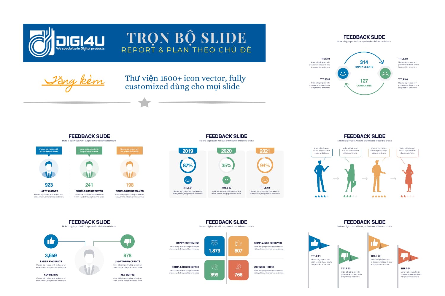 • Feedback Slides Template là bộ 20 slides mẫu làm báo cáo/ kế hoạch với visual ấn tượng & khả năng tùy chỉnh không giới hạn.