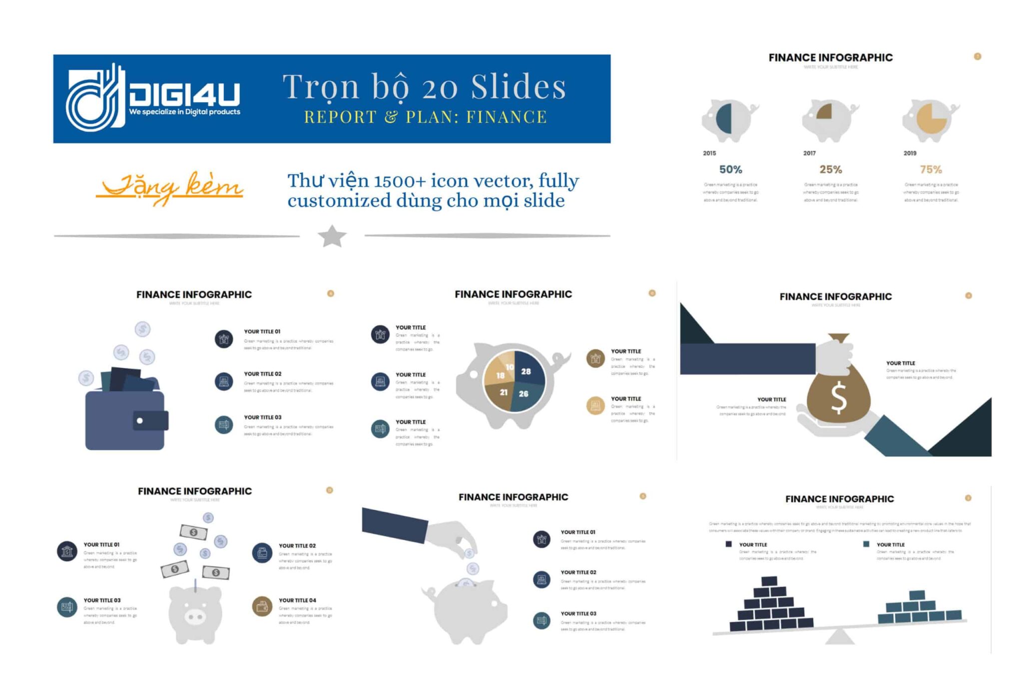 - Finance Template là bộ 20 slides mẫu làm báo cáo/ kế hoạch với visual ấn tượng & khả năng tùy chỉnh không giới hạn.