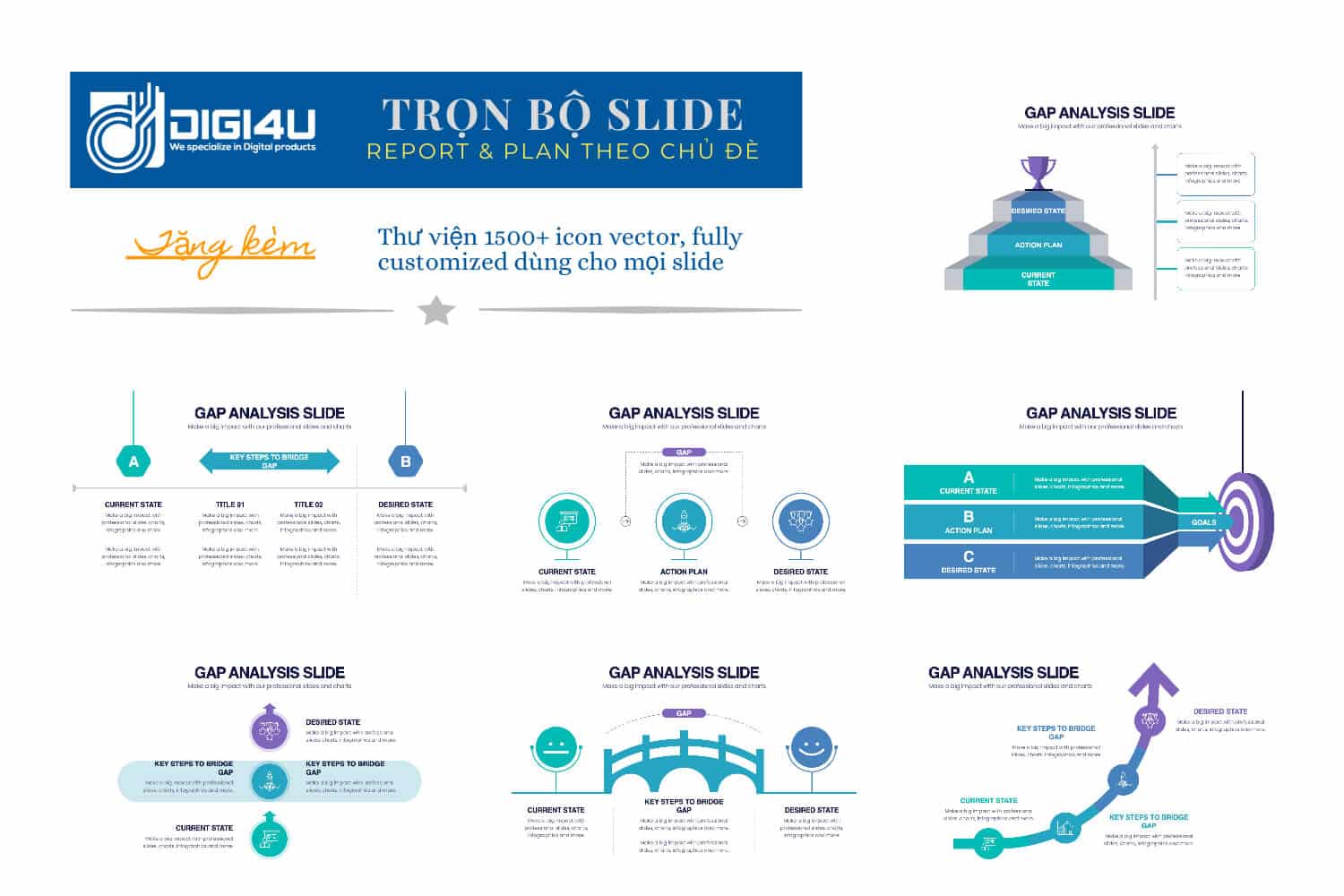 - Gap Analysis Template là bộ 20 slides mẫu làm báo cáo/ kế hoạch với visual ấn tượng & khả năng tùy chỉnh không giới hạn.