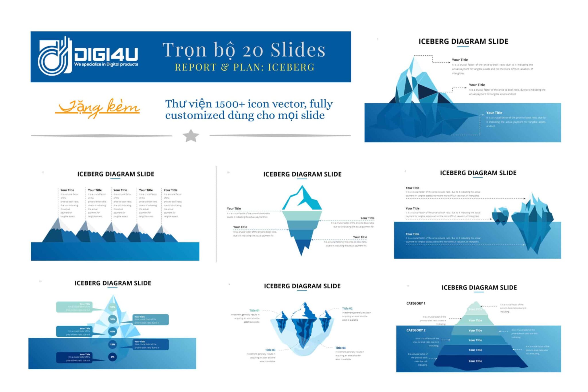- Iceberg Template là bộ 20 slides mẫu làm báo cáo/ kế hoạch với visual ấn tượng & khả năng tùy chỉnh không giới hạn.