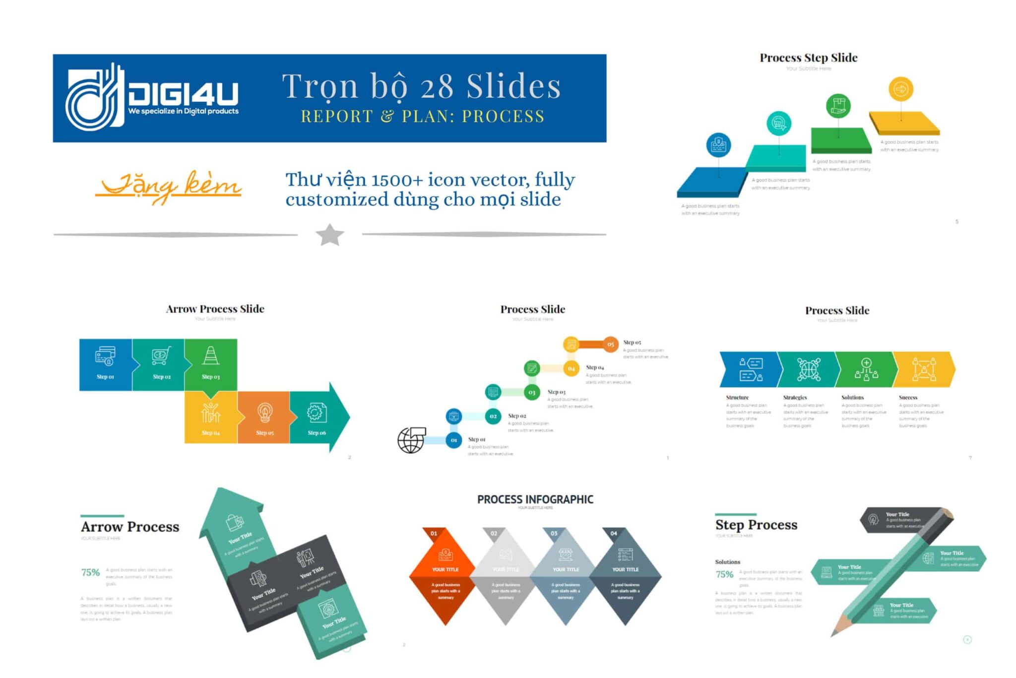 • Process Template là bộ 28 slides mẫu làm báo cáo/ kế hoạch với visual ấn tượng & khả năng tùy chỉnh không giới hạn.