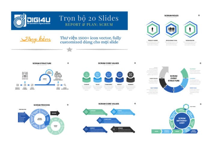 - SCRUM Template là bộ 20 slides mẫu làm báo cáo/ kế hoạch với visual ấn tượng & khả năng tùy chỉnh không giới hạn.